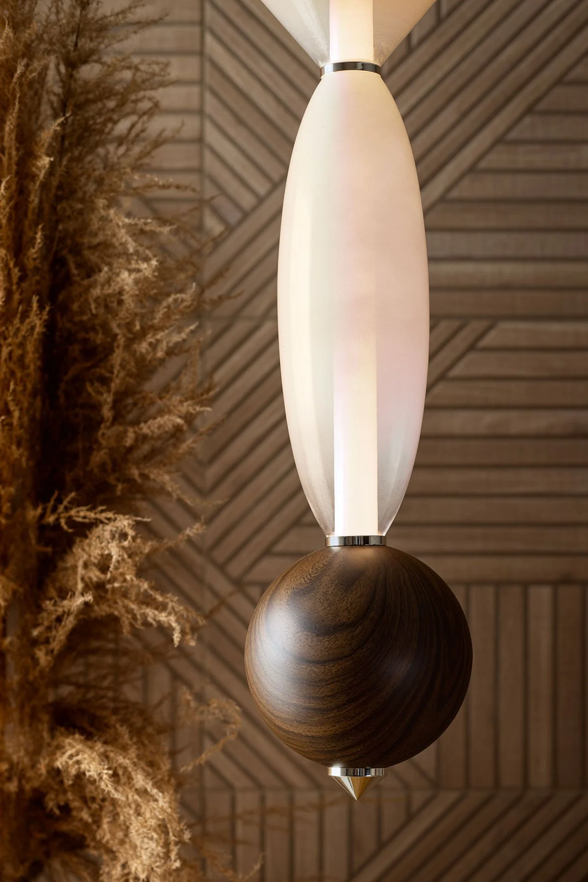 The Naij Natura Sculptural Earth Pendant brings sculptural elegance with grounded character, standing 27.5” high & 7.9” wide for a refined profile. An etched beige glass vessel with a soft ombre fade pairs with a walnut veneer sphere, adding depth & warmth through contrast. Its modular design positions the bulb through chrome rings, allowing flexible arrangements that adapt seamlessly to any interior.
